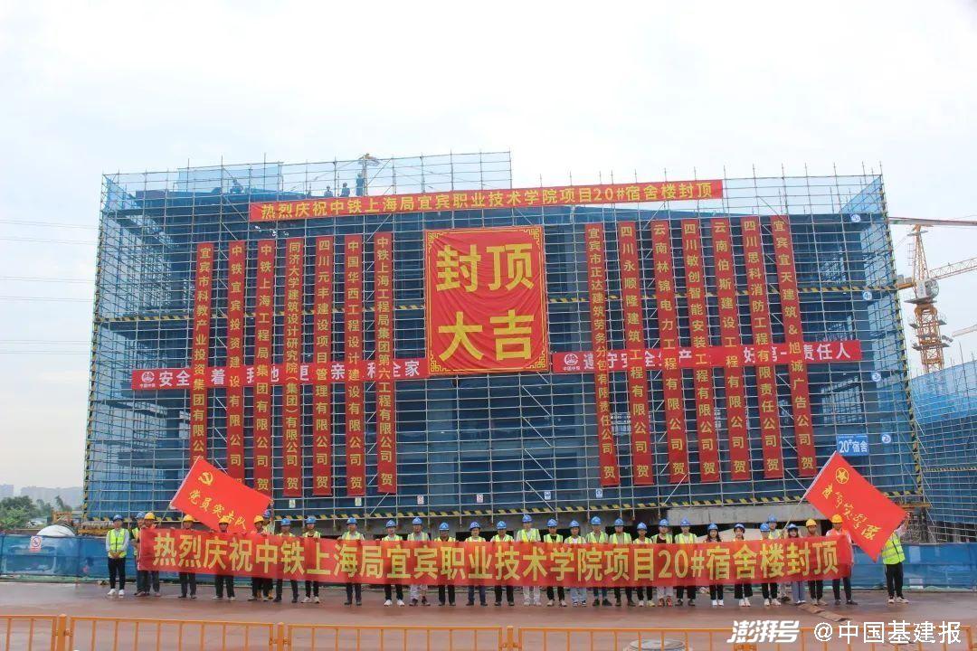 宜宾职业技术学院项目位于宜宾市南溪区高等职业教育园区内,施工内容为主校区6-20宿舍楼、东食堂、国际学院、人文学院、实训中心、五粮液灌装厂房、职工之家等,共计21栋单体。本次封顶的20宿舍楼为剪力墙结构,建筑面积约6552.52平方米,建筑楼层为5层,高度为20.35米,主要包括学生宿舍、党团活动区、公共活动室、洗衣房、开水间等。