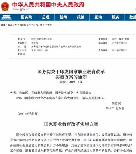 2019年1月,国务院印发《国家职业教育改革实施方案》,把奋力办好新时代职业教育细化为具体行动。开篇就提到: