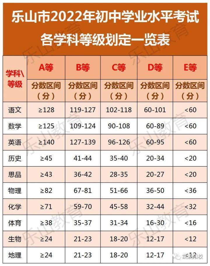 2022年,乐山市中考命题按照双减政策要求,紧扣新课程标准,体现学科育人价值,中考难度系数控制在0.6,逐渐向国家0.7的标准靠近(难度系数越小考题越难)。为利于考生更好地自我评价,现将中考各学科成绩等级划定分数区间公布如下: