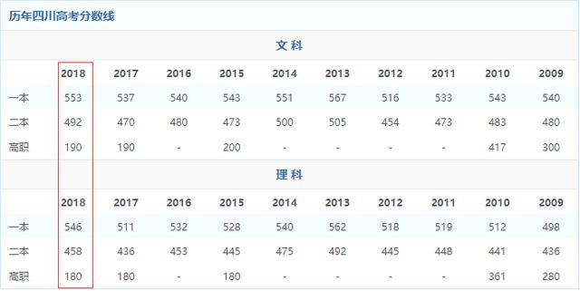 四川省2009-2018年高考分数线