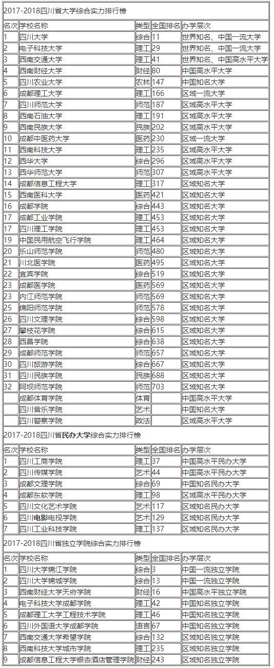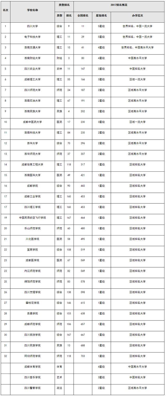 2017四川省大学综合实力排行榜