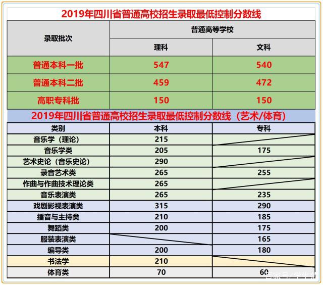 以上就是2019年四川省普通高校、艺术类及体育类的最低控制分数线;其中理科一批547分(18年为546分),理科二批459分(18年为458分);高职专科批150分(18年为180分)。文科一批540分(18年为553分),文科二批是472分(18年为492分),高职专科批150分(18年为190分)。整体而言,理科比去年上调了1分,但文科比去年下调了一二十分,幅度还是很大的。而高职大专一律下降为150分是为了配合国家高职扩招需求。