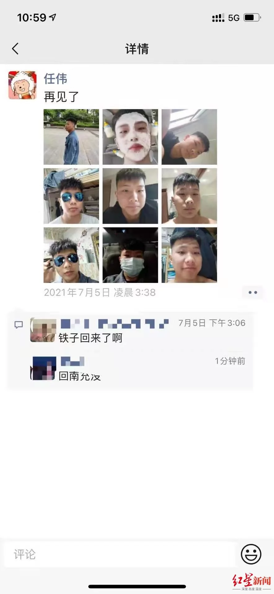 7月5日凌晨3点过,任伟在自己的微信朋友圈发布了一条信息,只有再见了短短的三个字,然后配了九张自己的照片。同时他给母亲发了一个520元的红包,并说:辛苦了。