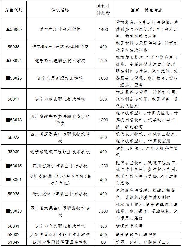 第一批次:志翔班志强班,录取学校有遂宁中学、射洪中学、蓬溪中学、大英中学、遂宁市职业技术学校、安居职业中学、射洪市职业中专校、大英县中等职业技术学校。