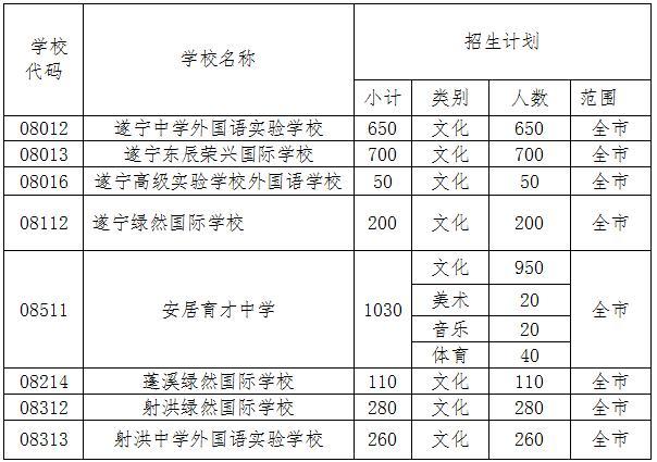 公办普通高中招生计划为11475人,其中安居区1460人,蓬溪县1890人,射洪市3000人,大英县2010人,船山区550人,国开区1015人,市直属1550人。