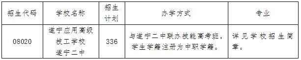 第四批次:中职学校,录取学校有遂宁市职业技术学校、遂宁市机电职业技术学校、遂宁应用高级技工学校、遂宁市船山职业技术学校、遂宁市安居职业高级中学校、蓬溪县中等职业技术学校、遂宁市建筑工程职业技术学校、射洪市职业中专学校、射洪旅游中等职业技术学校、遂宁鸿图电子电路技术职业学校、大英县中等职业技术学校、遂宁市飞宏职业技术学校、大英县蓝议科技职业技术学校、四川大学附设华西卫生学校。