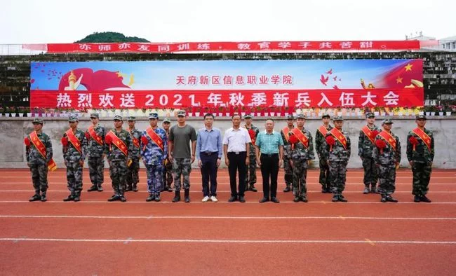 9月17日下午,四川省天府新区信息职业学院在田径场举行2021年秋季大学生应征入伍新兵欢送大会。学院党委委员、副院长邱永成,学生事务部部长、国防教育学院院长李民志,国防教育学院党支部书记、副院长孙传胜,学院征兵工作站站长邱政出席大会,全体辅导员老师、应征入伍新兵及新兵家属、2021级全体新生参加。