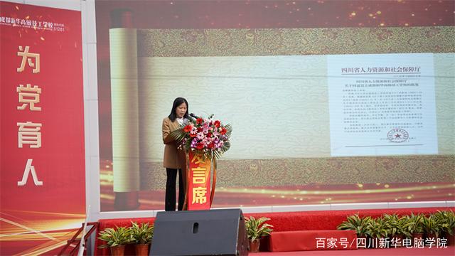 成都市人社局职业能力建设处处长杨建代表成都市人社局职业能力建设处,对四川新华升格为成都新华高级技工学校表示热烈的祝贺,并希望学校进一步加大投入,强化教学管理和内涵建设,不断改善办学条件,提升办学质量和水平,大力培养高技能人才,努力打造高技能技工教育品牌,争取成为全省技工教育新标杆,为技能人才的培养做出更大的贡献!