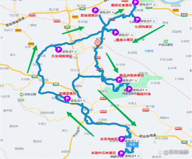 2、自驾游行程路线:长宁县-藕花洲旅游景区-蜀南竹海-余泽鸿故居-西部竹石林旅游景区-龙蟠溪景区-苦竹·天泉景区-佛来山旅游区-梅白碧浪湖-七洞沟旅游景区-蜀南花海景区-长宁县。