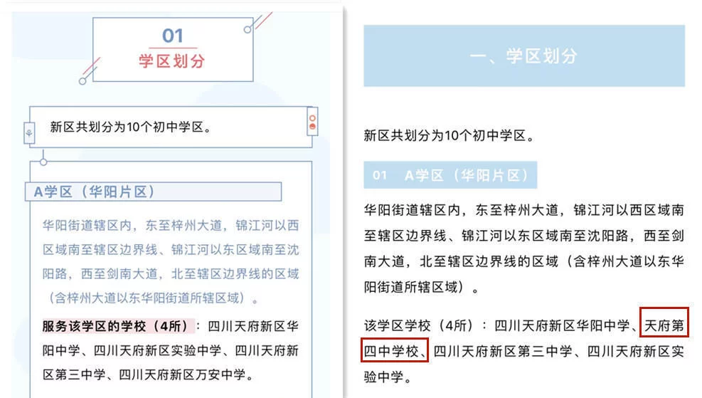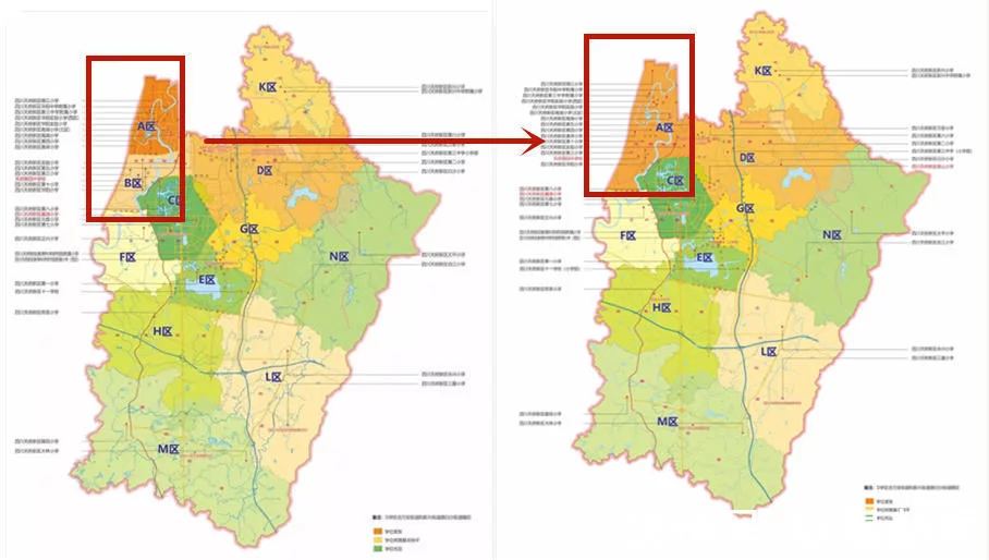 左图为四川天府新区2021年初中学区划分方案,右图为四川天府新区2022年初中学区划分方案