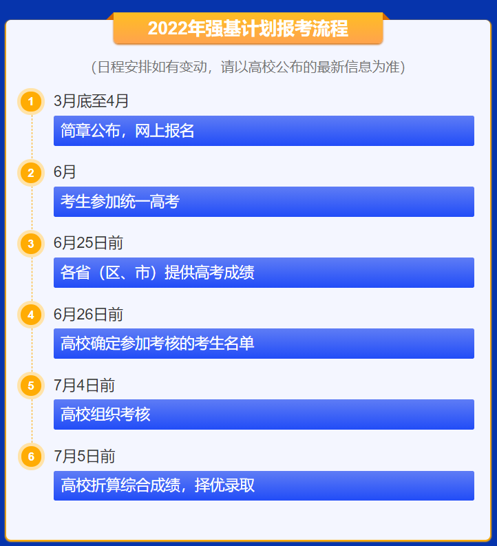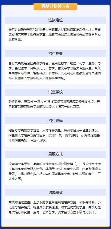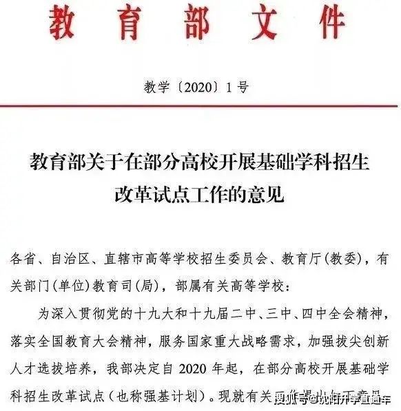 2020年1月,教育部发布《关于在部分高校开展基础学科招生改革试点工作的意见》,决定自2020年起,在部分高校开展基础学科招生改革试点,也称强基计划。强基计划深入总结了高校自主招生和上海等地高考综合改革试点经验,是继《国务院关于深化考试招生制度改革的实施意见》发布以来,高校人才选拔培养迎来的又一重大变革,集中体现了新高考的改革方向。