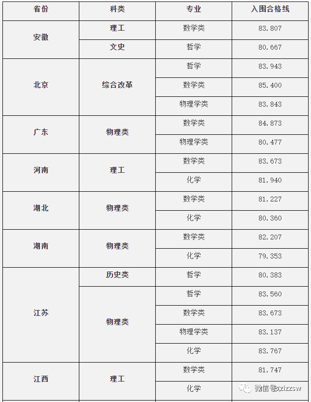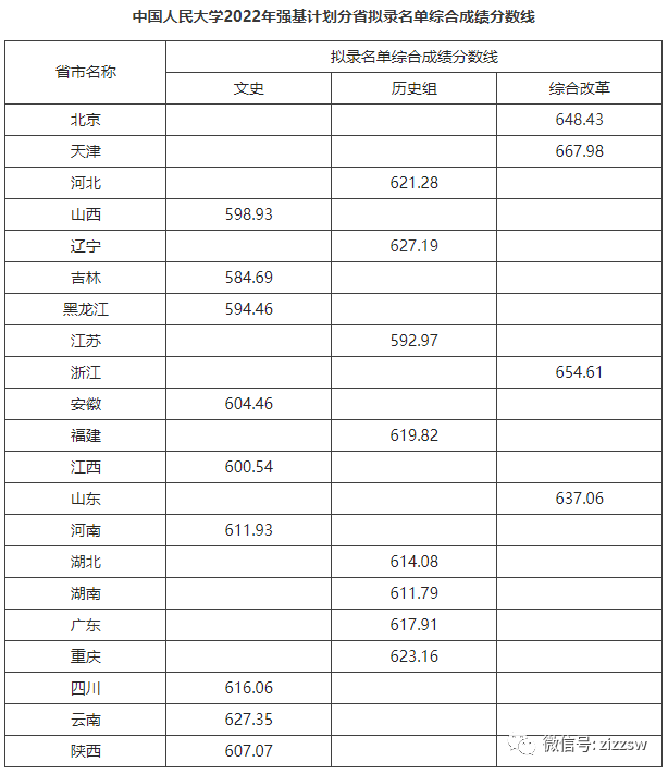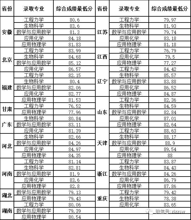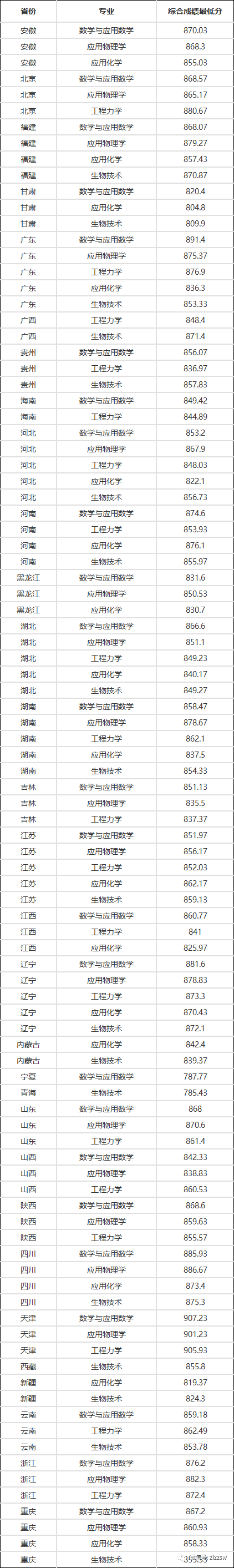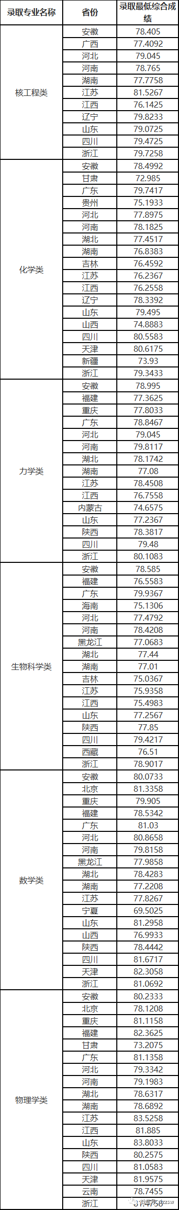 根据《中国科学技术大学2022年强基计划招生简章》相关规定,现将中国科学技术大学2022年强基计划(第一类考生)招生专业在相关省(自治区、直辖市)录取最低综合成绩公示如下: