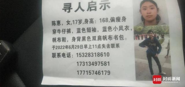 根据李女士提供的信息,陈惠身高168cm,出走时身穿蓝色短袖、蓝色小风衣、牛仔裤和帆布鞋,背着一个黑色双肩帆布书包。如果大家有女孩的线索,可以拨打李女士的手机15328318610取得联系。