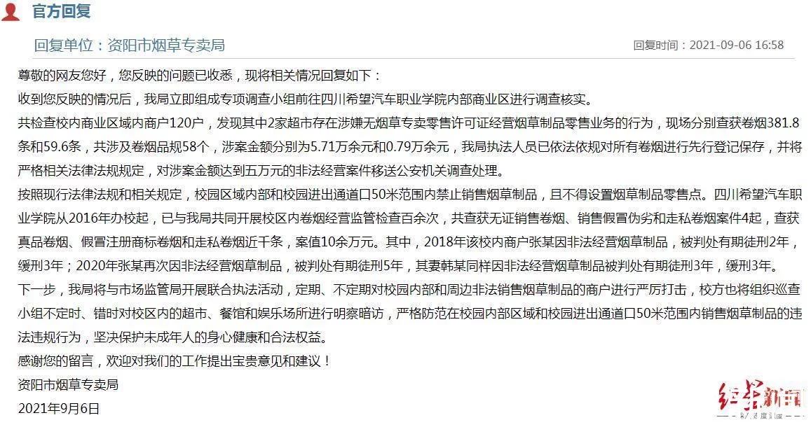 红星新闻记者查询发现,9月6日,资阳市烟草专卖局公开回复称,在接到反映后,该局立即组成专项调查小组,前往四川希望汽车职业学院内部商业区进行调查核实。经检查校内商业区域内商户120户,发现其中2家超市存在涉嫌无烟草专卖零售许可证经营烟草制品零售业务的行为,现场分别查获卷烟381.8条和59.6条,共涉及卷烟品规58个,涉案金额分别为5.71万余元和0.79万余元。执法人员已依法依规对所有卷烟进行先行登记保存,对涉案金额达5万元的非法经营案件,将移送公安机关调查处理。