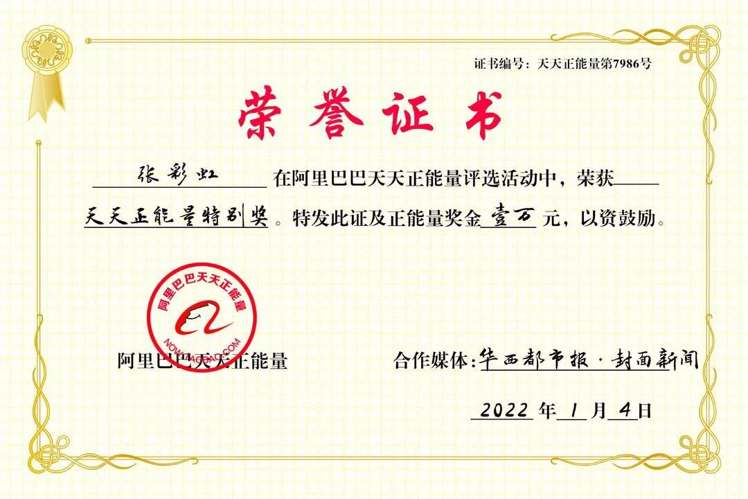 1月4日下午,阿里巴巴天天正能量联合华西都市报、封面新闻,授予暖心女孩张彩虹天天正能量特别奖,并奖励一万元正能量金。阿里巴巴天天正能量在颁奖词中写到: