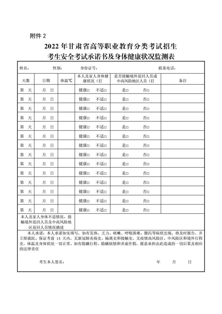 根据省疫情防控工作有关要求,所有考生考前14天开始自行做好每日体温测量、记录,如实填写《2022年甘肃省高等职业教育分类考试招生考生安全考试承诺书及身体健康状况监测表》(见附件2),经本人签字后交考点学校留存。考生不得提供身体健康状况虚假信息,对隐瞒行程、隐瞒病情、故意压制症状、瞒报漏报健康情况的考生及所在学校追究相应责任。