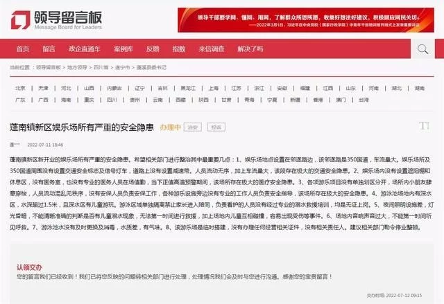更令人痛心的是,原本这场事故是可以避免的,因为在事故发生前曾有居民在几天前投诉该游乐场所有安全隐患。7月11日18时46分,网友在《人民网》的《领导留言板》上投诉称,蓬南镇新开业的新区娱乐场所有严重的安全隐患。具体表现在该娱乐场所存在极大的交通安全隐患、医疗安全隐患、游泳池看护人员无证上岗、容易出现受伤等事件、游泳池水质差、游乐场是临时搭建未办理任何经营相关证件等方面,该网友建议相关部门勒令停业整顿。相关部门也积极回应您的留言我们已经收到!我们已将您反映的问题转相关部门进行处理,处理情况我们会及时与您进行沟通。