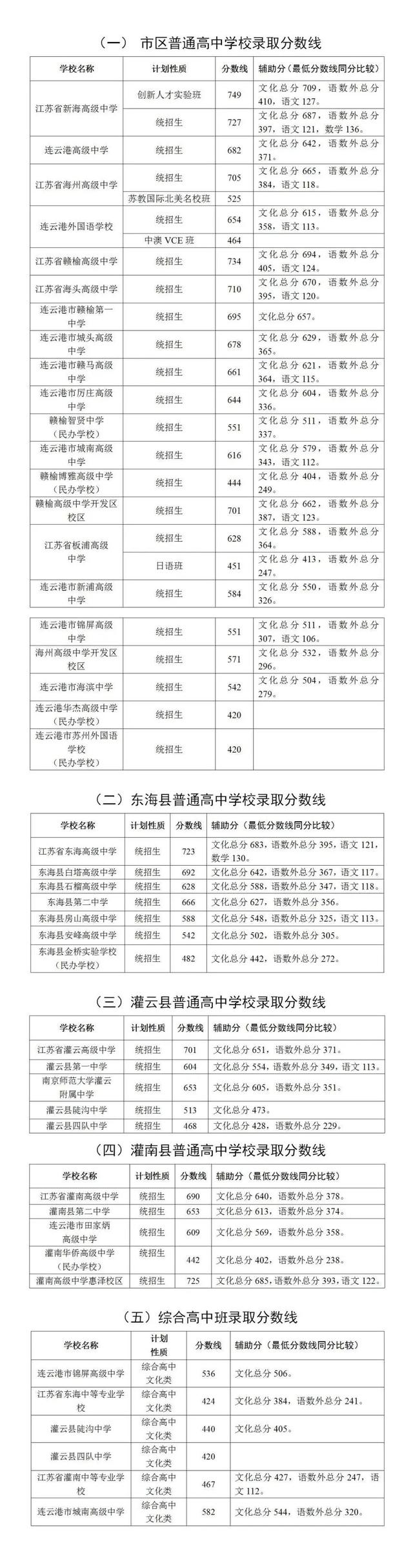 1.今年我市各普通高中继续执行按区域招生、分区域管理政策,各招生区域公办普通高中(不含国际班)录取最低控制分数线分别为:市区(含赣榆区)480分,东海县480分,灌云县460分,灌南县480分。全市各民办普通高中录取最低控制分数线420分;全市各综合高中班录取最低控制分数线420分。