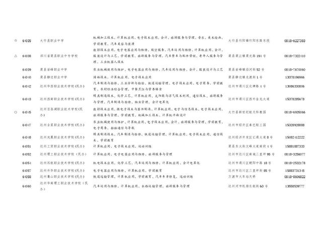 2020年具有中等职业学历教育招生资格学校457所(校名前☆为国家中等职业教育改革发展示范学校,△为国家级重点中职学校,○为省级重点中职学校)。其中,教育部门管理的职业学校368所,开设专业223个,开办专业点2734个;人力资源和社会保障部门管理的技工院校89所(其中,技师学院21所,高级技工学校11所,技工学校57所),开设专业155个,开办专业点835个。