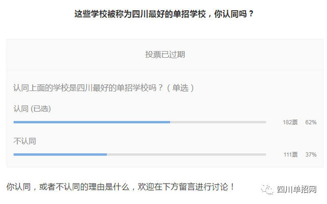 前面我们发布了一篇文章,四川最好的单招学校有哪些? 我们在文章最后留了一个投票,问大家认同不认同,来看看最后的投票结果: