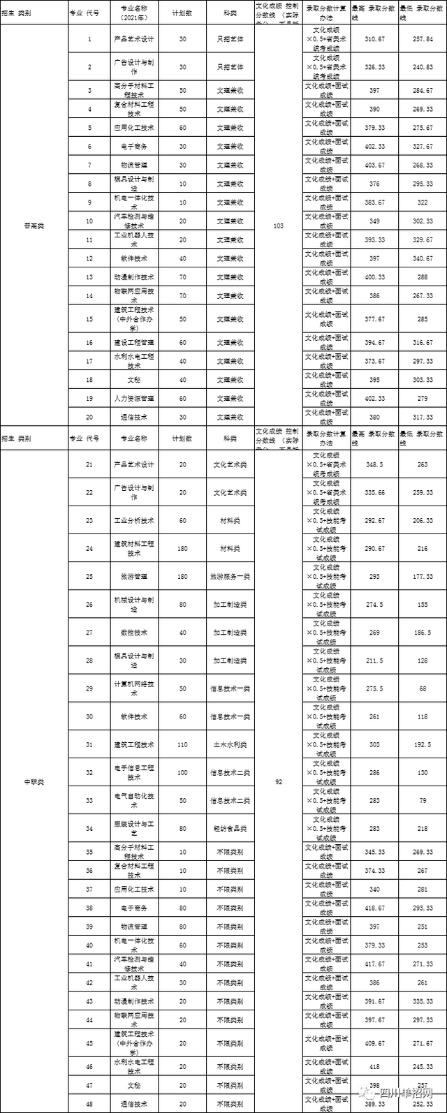 从上面的数据可以看到,四川工程职业技术学院是采用的双划线的模式,及文化成绩和综合素质都要达到合格线,才有机会被录取。录取时按总分从高到低进行录取。
