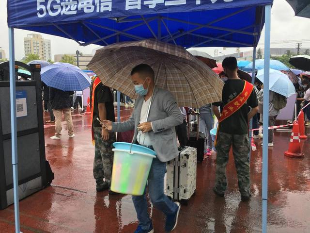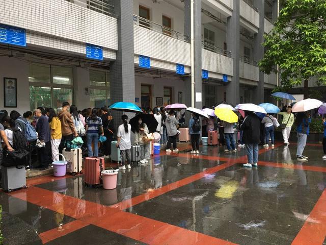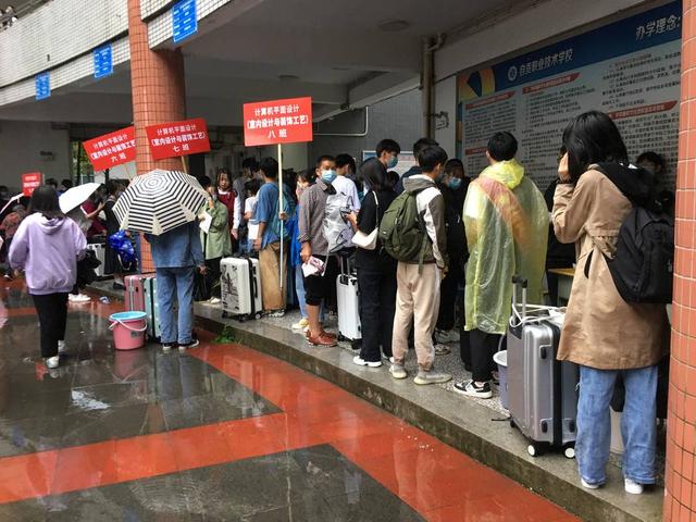 8月28日,一排排新生整齐地打着伞,等待着接受疫情防控的检查,然后进校园报名。当天,3000余名来自自贡及泸州、内江、成都等地的学生,赶到自贡职业技术学校报名。