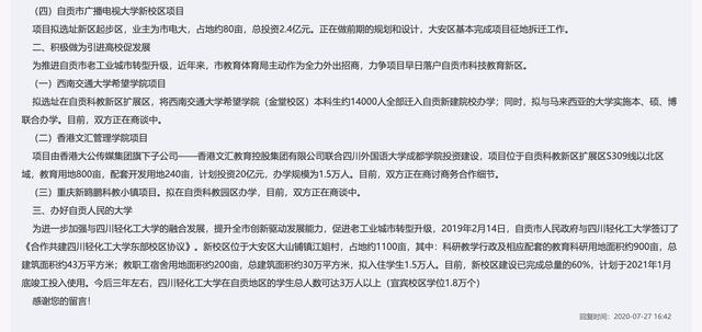近日,有网友通过人民网领导留言板留言希望市政府酌情考虑一下,为自贡引进一些高校。