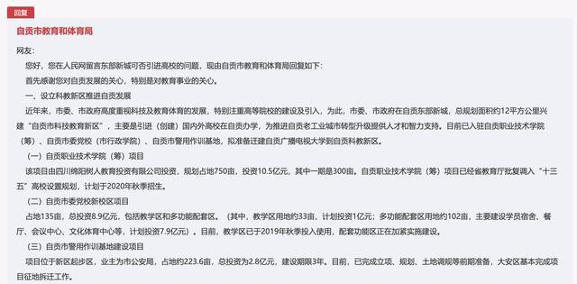 对此自贡市教育和体育局回应表示,近年来,市委、市政府高度重视科技及教育体育的发展,特别注重高等院校的建设及引入,为此,市委、市政府在自贡东部新城,总规划面积约12平方公里兴建自贡市科技教育新区,主要是引进(创建)国内外高校在自贡办学,为推进自贡老工业城市转型升级提供人才和智力支持。