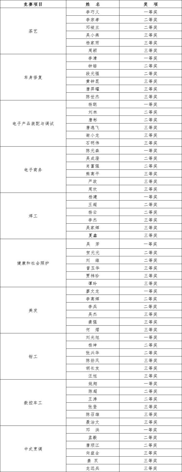 170名选手在公平、公开、公正的氛围中,沉着应战、激烈争夺,最终决出胜负。李巧义获得茶艺项目一等奖,李清获得车身修复项目一等奖,杨聪获得电子产品装配与调试项目一等奖,陈元森获得电子商务项目一等奖,杨建获得焊工项目一等奖,吴芳获得健康和社会照护项目一等奖,廖文龙获得美发项目一等奖,刘光旭获得钳工项目一等奖,姚翔获得数控车工项目一等奖,邓洪中式烹调项目一等奖。据悉,获奖部分优秀选手将代表我市参加2019年四川省工匠杯职业技能大赛和全省第七届农民工技能大赛。