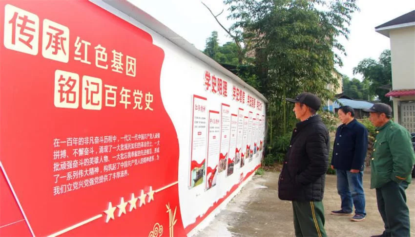 聚贤镇石板凳村党员群众到党史文化墙重温中国共产党的百年历程。遂宁市委宣传部供图