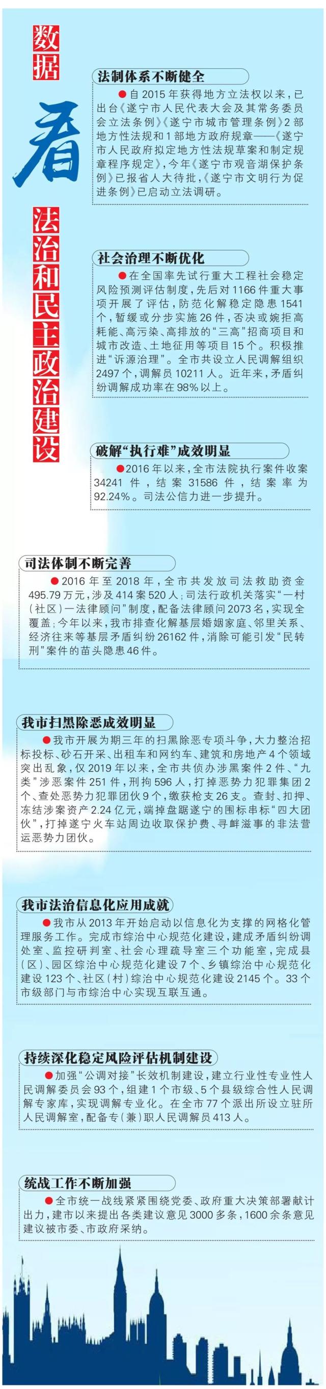 新中国成立70年来,尤其是党的十八大以来,在党中央和省委的坚强领导下,遂宁民主政治和法治建设不断发展进步,有力保障了全市各项事业在法治轨道上运行。