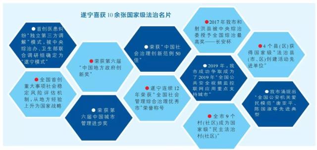全国首创重大事项社会稳定风险评估机制,全国首创医患纠纷独立第三方调解模式,连续12年荣获全国社会管理综合治理优秀市荣誉称号,2017年我市和射洪县被中央综治委授予全国综治最高奖——长安杯……10余张亮丽的国家级法治名片,不仅让遂宁实现多个中省率先,也见证着70年来法治遂宁建设所取得的巨大成就。