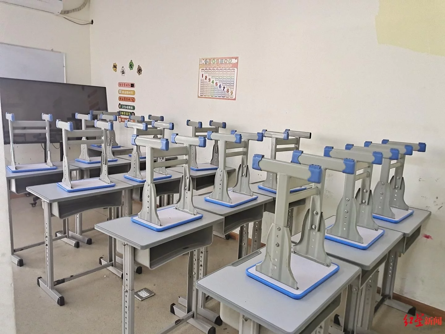 8月17日下午,遂宁当地一家教培机构没有上课,课桌整齐地摆放着。