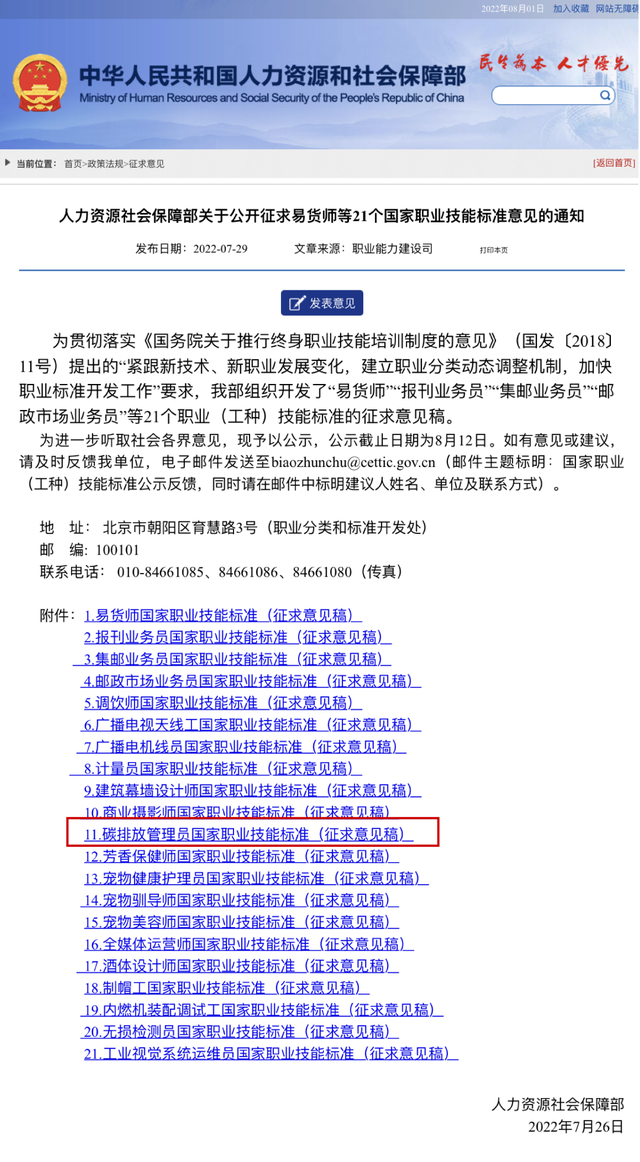 7月29日,人社部官网发布了《碳排放管理员国家职业技能标准》(征求意见稿),就标准进行公开征求意见。这是碳排放管理员职业能力建设工作的一个重要里程碑,将对我国碳达峰碳中和专业人才培养工作起到积极推动作用。