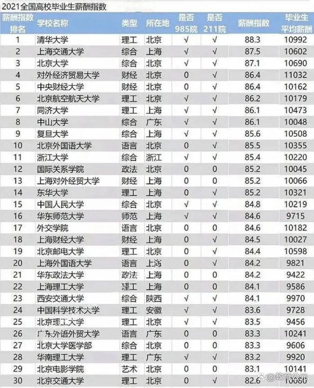 从榜单前30强中,我们可以看到,绝大多数都是985、211类大学,双非院校并不多,而且都是大学排名非常靠前的,像排名前五的清华、上海交大、北大、对外贸易经济大学、中央财经大学,前三个不用多说,后面两个作为两财一贸其中的大学,实力也很强悍,毕业生发展前景非常不错。