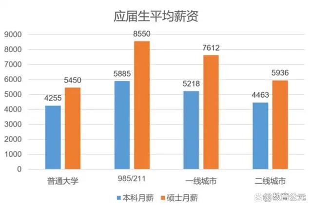 从表中我们不难看出,普通大学毕业生与985/211高校的毕业生收入水平还是存在一定的差距。特别是本科生与研究生的薪资水平,差距就更大了,由此可见学历越高,薪资越高,学历与薪资水平成正比,一个211毕业的研究生起薪能达到8550元。