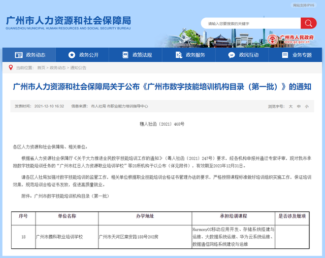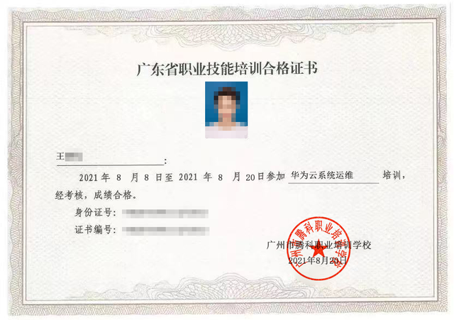 《广东省职业技能培训合格证书》样式作为第一批广州市数字技能培训机构,广州市腾科职业培训学校承担着免费培训数字技能的任务。本次培训腾科职校提供了华为云系统运维等5个工种。
