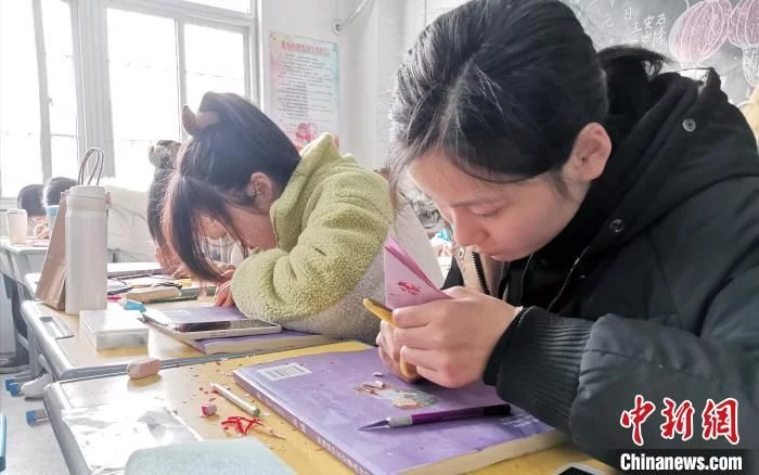 中新网合肥1月12日电 (吴孝文 张强)传统民间剪纸和年画里,常用‘莲’寓意‘年年有余’,你们在创作窗花时要用上虎和莲的元素。同时,莲和‘年’‘廉’谐音,要与廉政文化结合起来。连日来,安徽省合肥市通用技术学校2019级15班的教室里年味十足,授课老师黄发科带领学生剪刻虎年窗花,倡导廉政文化,喜迎新春。