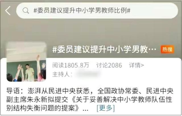 事实上,在2021年两会期间,全国政协委员、民进中央副主席朱永新就提到了中小学男女教师比例失衡的问题,他称学校没有男老师,学生的阳刚之气会受到影响,从而影响教育事业的发展。