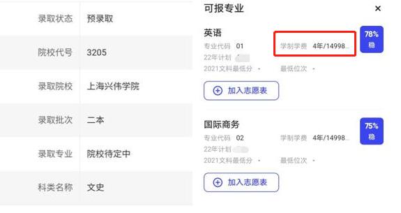 据上游新闻,7月底,来自安徽的小刘(化名)被上海兴伟学院预录取。8月3日,她告诉记者:当初填报的时候,系统根据分数给我评估的成功率是78%。学制4年,但系统没把学费149985元的个位‘5’显示出来,以为学费是14998元,就填报了。等到预录取了才发现,一年学费近15万,4年就是60万了,太贵了,接受不了,不打算去读了。