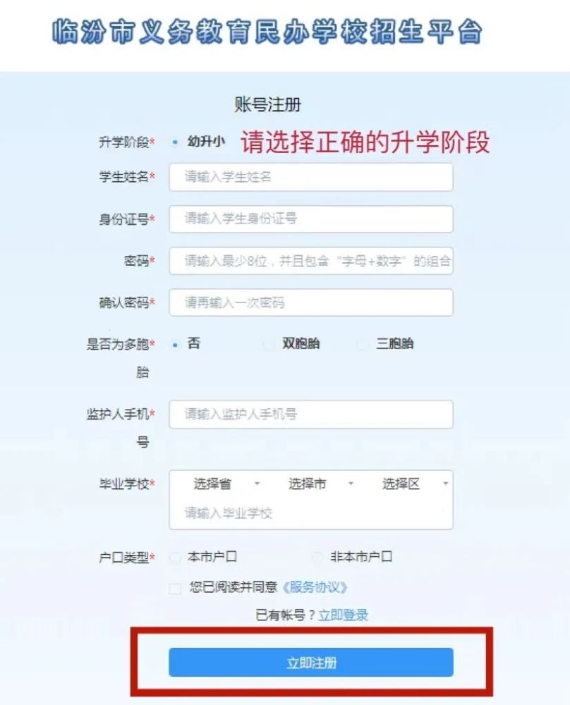 第三步:选择正确的升学阶段:幼升小 或 小升初;依次填写学生信息、设置密码等。