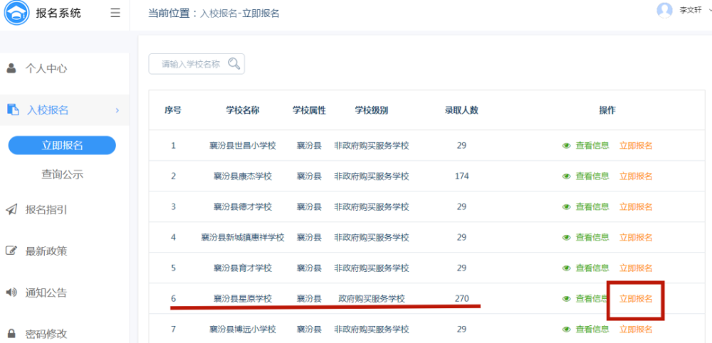 第八步:选择襄汾县星原学校点击立即报名。