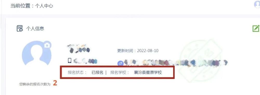 第九步:点击个人信息查看报名状态及报名学校是否正确。若正确则报名完成,若不是自己选择的学校,(还有报名次数)则可选择从第八步开始重新报名。(三次机会用完,则不可修改)