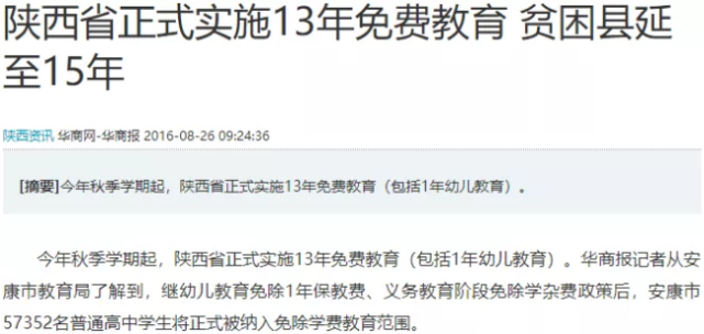 而放眼全国,此前四川、云南、河南等地亦有不少地区开始推行高中免学费政策。陕西省更是宣布从2016年秋季学期开始全省高中教育免费,从而全面实现从学前1年到高中3年的13年免费教育。