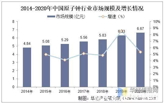 2014至2020年期间,我国原子钟行业市场规模由4.84亿元稳步增长至6.67亿元,年复合增长率为5.5%。