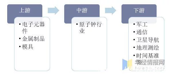 原子钟隶属于时间频率行业,原子钟行业的产业链上游包括电子元器件制造业和金属制品业等,下游主要应用于卫星导航、军工、通信等领域。