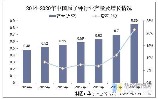 目前世界上最准确的计时工具就是原子钟,于20世纪50年代出现。近年来我国原子钟产量持续增长,2020年中国原子钟行业产量达0.85万套,较2019年增长21.43%。