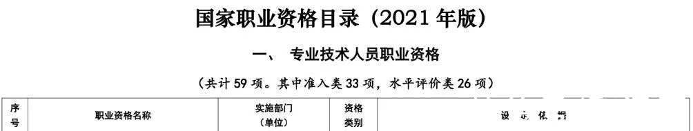 2021年版国家职业资格目录共计72项职业资格。其中,专业技术人员职业资格59项,含准入类33项,水平评价类26项;技能人员职业资格13项。备受保险业关注的精算师,位列第56项,资格类别为水平评价类,实施部门(单位)为银保监会、人力资源社会保障部、中国精算师协会。