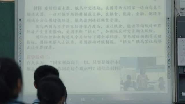 一块屏网课班政治课上,成都七中的老师讲述国家利益议题时,分享媒体观点、外交部表态等,拓展学生认知能力