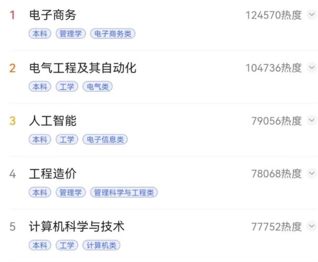 根据相关平台的数据显示,今年的高考专业排名前五的是分别是电子商务、电气工程及其自动化、人工智能、工程造价、计算机学科与技术。可以看出,这五个专业都是理工科类的专业。不过也正是因为社会还是非常需要理工科人才,企业对这方面的人才也比较缺乏,所以才造就了这一热门趋势。